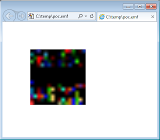 In order to see the pixel values I put poc.emf onto an HTML canvas and printed the pixel values with JavaScript. Diffing the results after consecutive PoC reloads showed that the only pixel that didn't change was the one in the lower left corner (if you look really closely at the screenshot above you will find a red smudge right there).